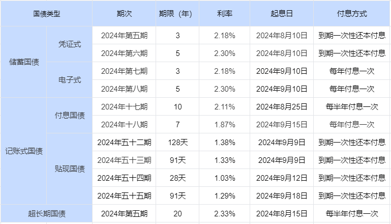 2024年第七期,期限3年,票面利率2.18%;2024年第八期,期限5年,票面利率2.3%。