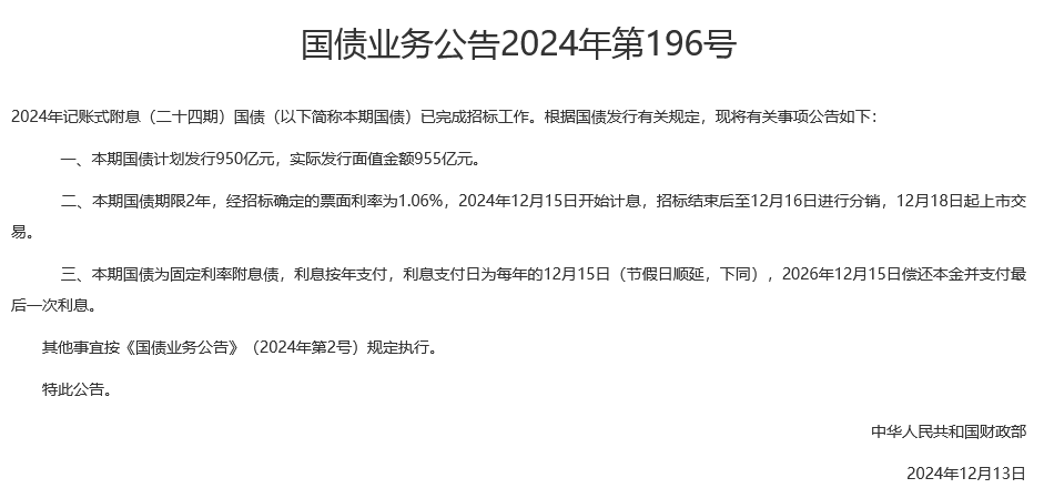 本期国债计划发行950亿元,实际发行面值金额955亿元。期限2年,票面利率为1.06%,2024年12月15日开始计息。利息按年支付,利息支付日为每年的12月15日(节假日顺延),2026年12月15日偿还本金并支付最后一次利息。