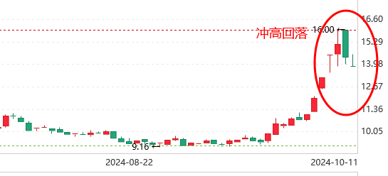 冲高回落指某个股票在当日的市场交易过程中急速无量上涨,然后在当天的交易结束前放量下跌的现象。冲高回落的特征是当日收盘时该股票的K线会存在一条上影线。