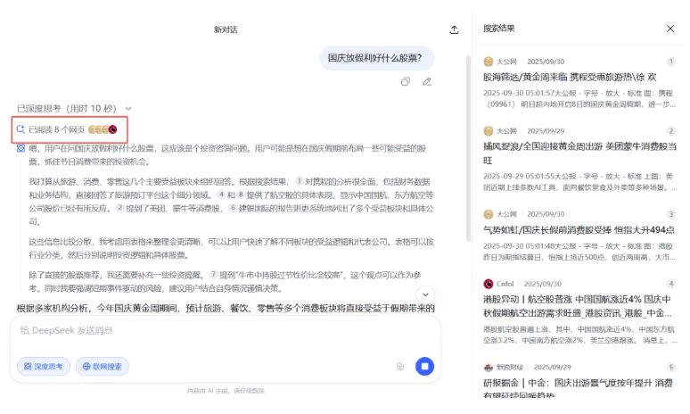 在它回答你的时候,会同步联网搜索关键词:国庆放假利好什么股票?