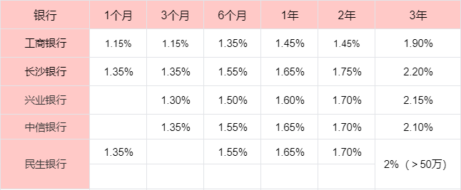 一个月利率1.15%;三个月利率1.15%;六个月利率1.35%;一年期利率1.45%;两年期利率1.45%;三年期利率1.9%。