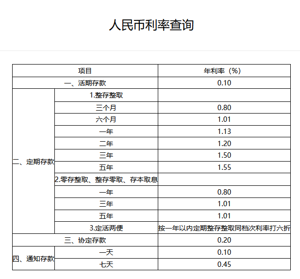 整存整取:三个月0.80%,六个月1.01%,一年期1.13%,两年期1.20%,三年期1.20%,五年期1.55%;
