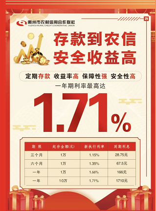 整存整取:三个月1.15%(起存金额为1万元),半年1.35%(起存金额为1万元),一年1.66%(起存金额为1万元),一年1.71%(起存金额为10万元);