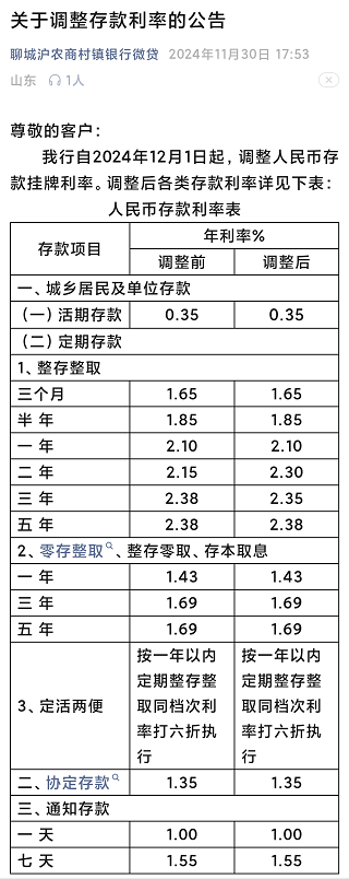 整存整取:三个月1.43%,半年1.69%,一年2.05%,两年2.15%,三年2.45%,五年2.45%;