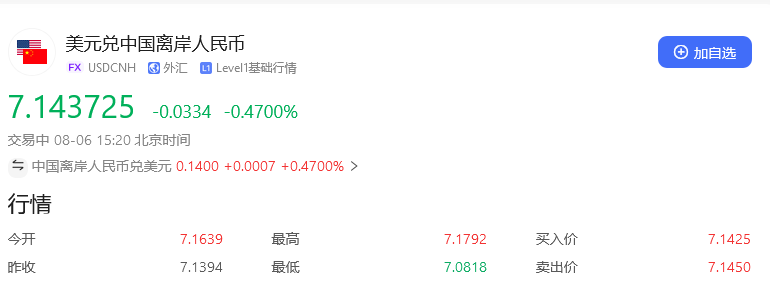 美元离岸人民币汇率上涨,意味着人民币贬值。