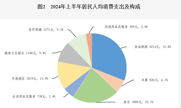 2024年上半年,全国居民人均消费支出13601元。分城乡看,城镇居民人均消费支出16780元,农村居民人均消费支出9197元。