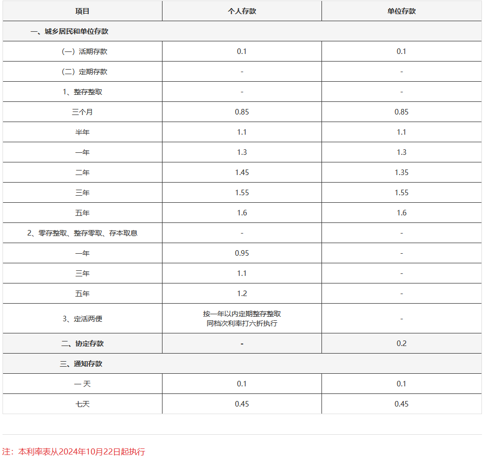 整存整取:三个月利率0.85%;六个月利率1.1%;一年期利率1.3%;两年期利率1.45%;三年期利率1.55%;五年期利率1.6%。